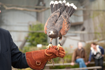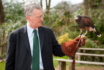 A flying lunch for Hilary Benn, minister for the environment, at the Cotswold Falconry Centre in Batsford Park just one mile from Moreton in Marsh, Gloucestershire. Hilary is seen here with one the centre's Harris Hawks; its short, rounded wings and large tail enable it to hunt in dense woodland and forest, maybe he'll have had a few tips for Hilary in the Westminster Jungle!