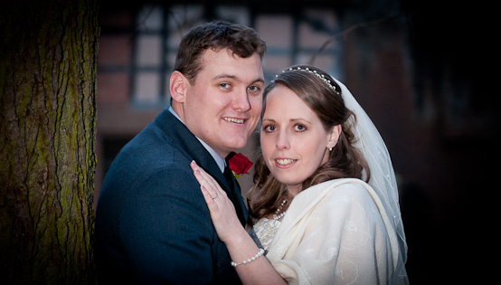 the couple are lit with two speedlights to give some depth and avoid that 'pasted in' effect that can come from flash. They have Holy Trinity Church in the background; I use a wide aperture (f1.4) to