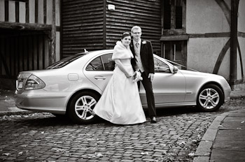 I rather liked the retro feel to this shot of the newlyweds with their Merc outside Cheylsemore House